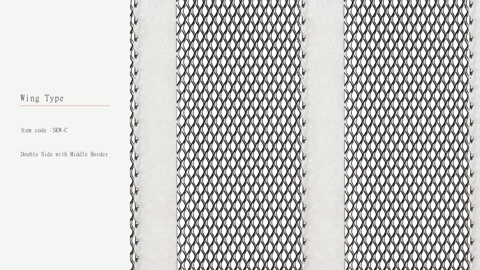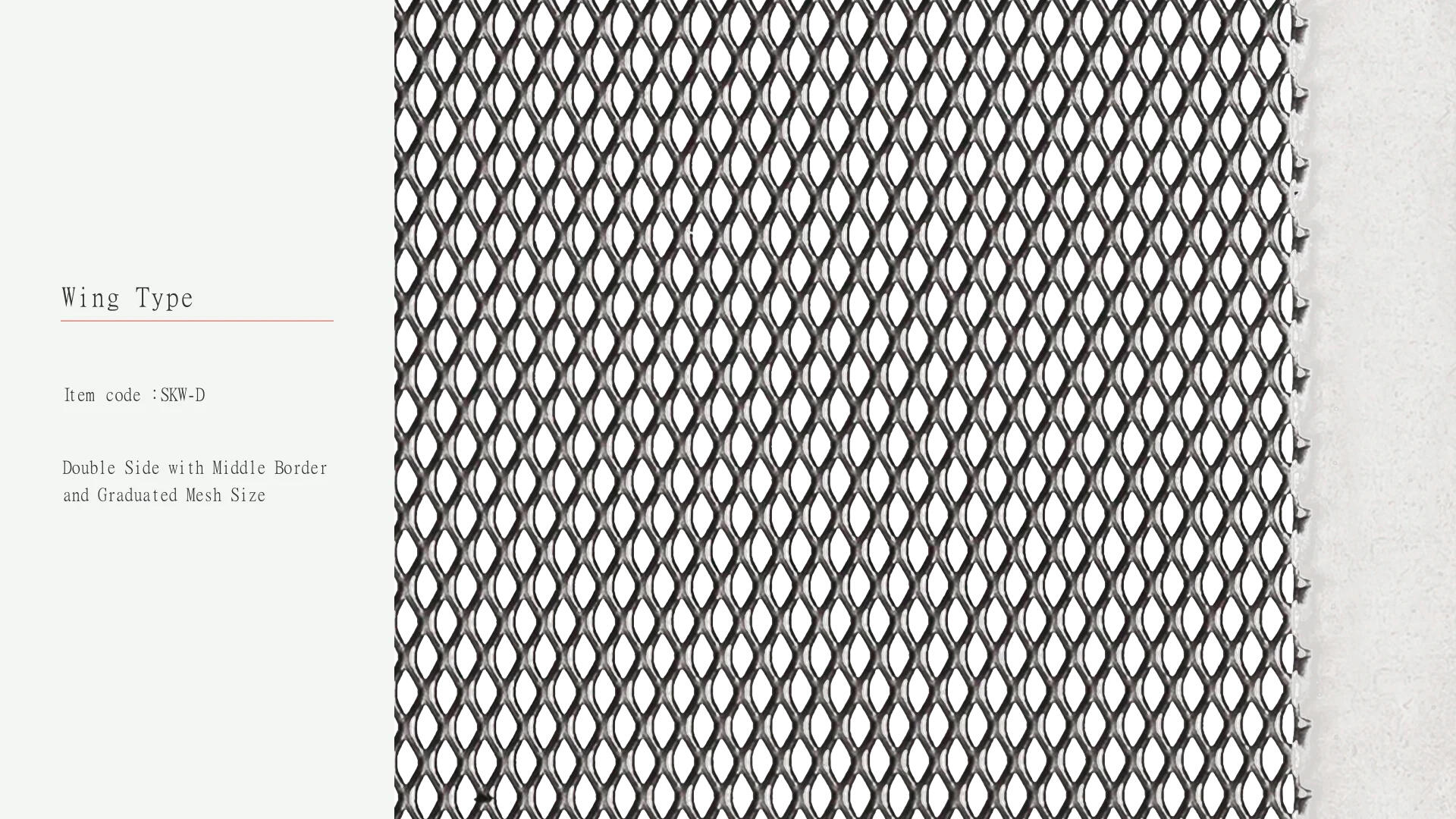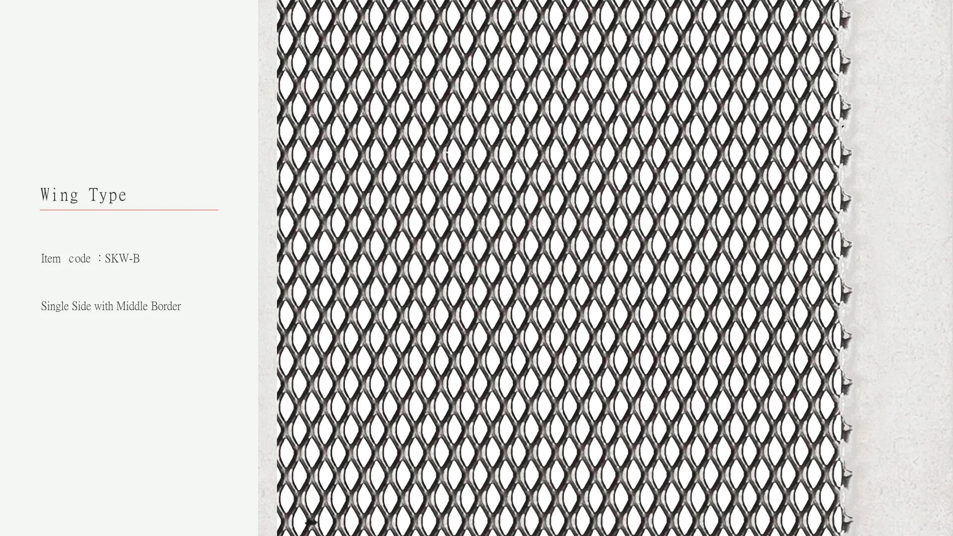 ウィングタイプは金属板とメッシュパターンで構成されており、メッシュサイズはお客様のご要望に合わせて調整可能です。両サイドにボーダーを配したデザインや、交互に間隔をあけたデザインなど、様々なデザインからお選びいただけます。現在、このタイプのメッシュは工業デザイン製品に広く利用されています。例えば、家具の用途では、エッジ部分を特定の形状に折り曲げることで接合面の厚みを増やすことができます。また、リチウム電池内部のイオン活性界面に応用することで電気エネルギーを発生させ、電池の寿命を延ばすことも可能です。